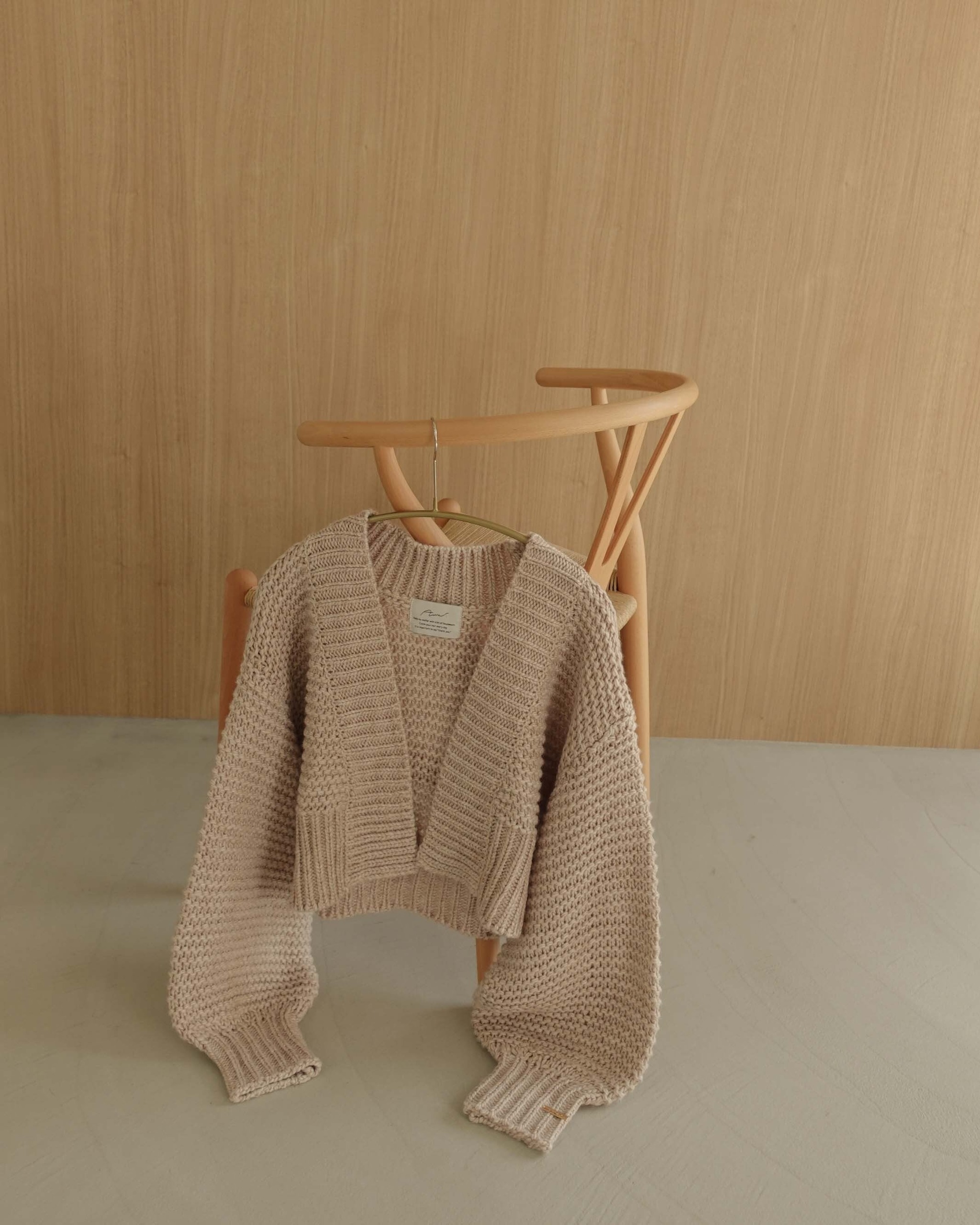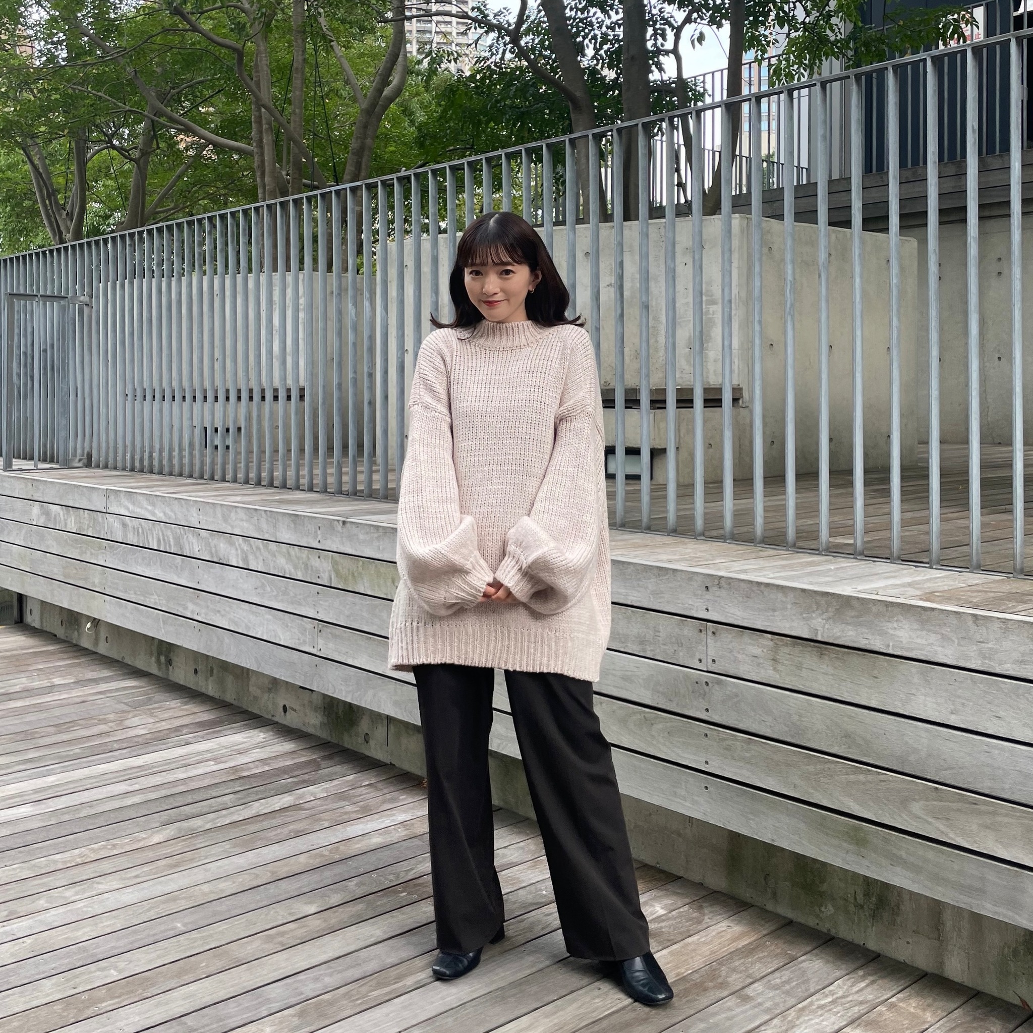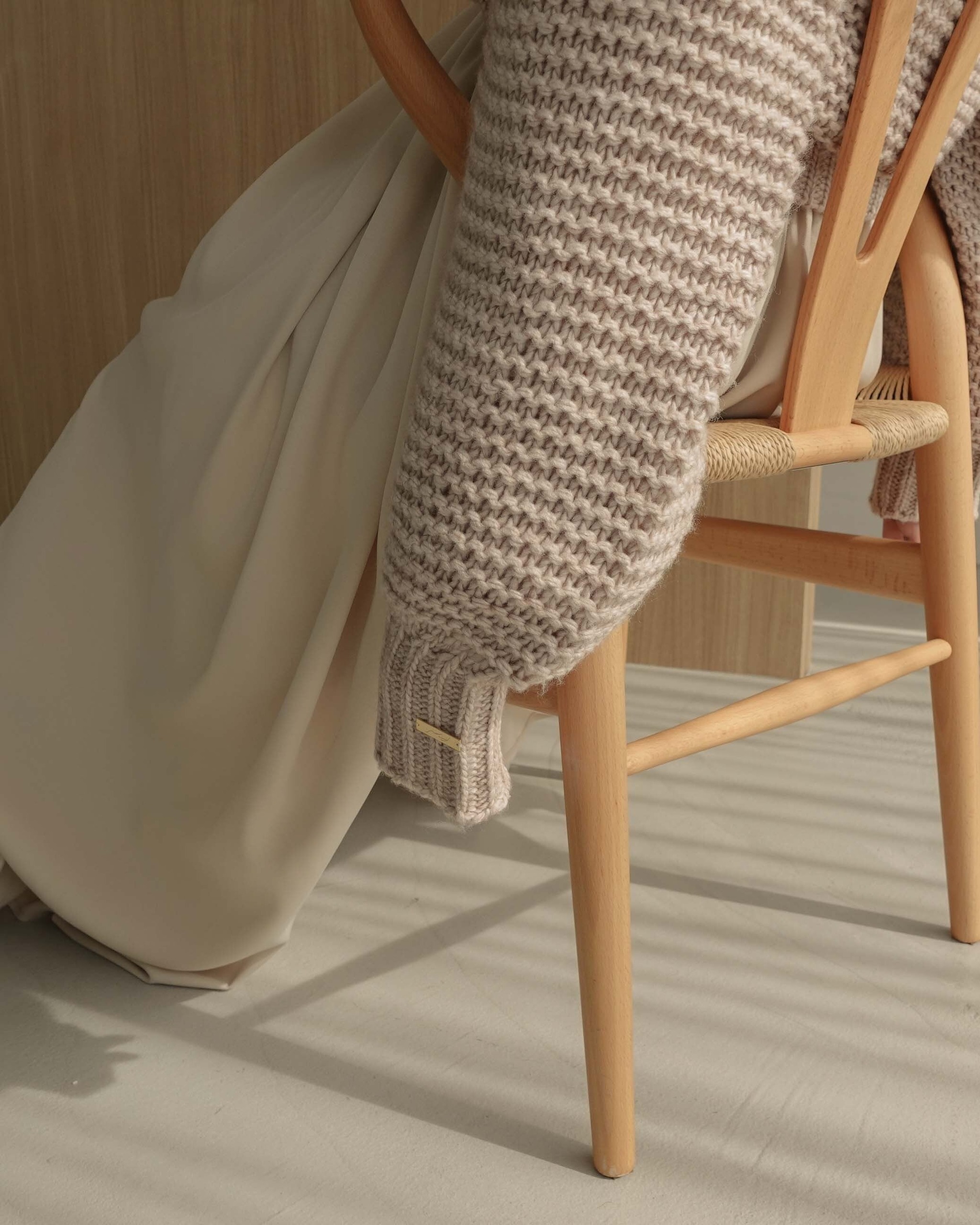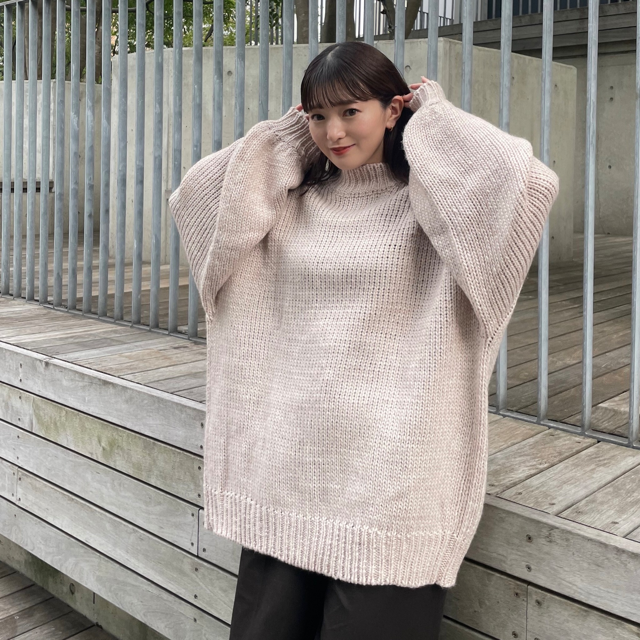 袖のボリューム感とざっくり編んだ編み地がポイント。