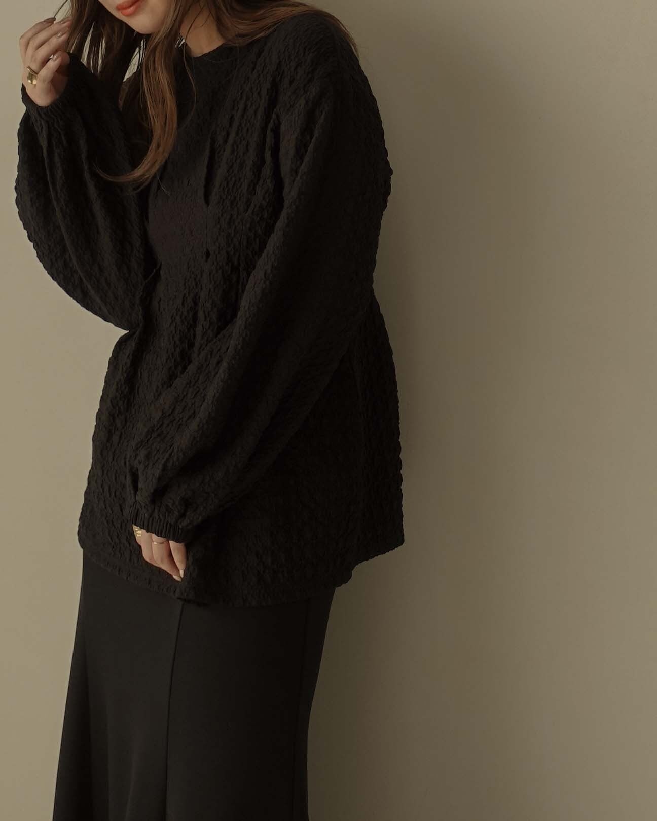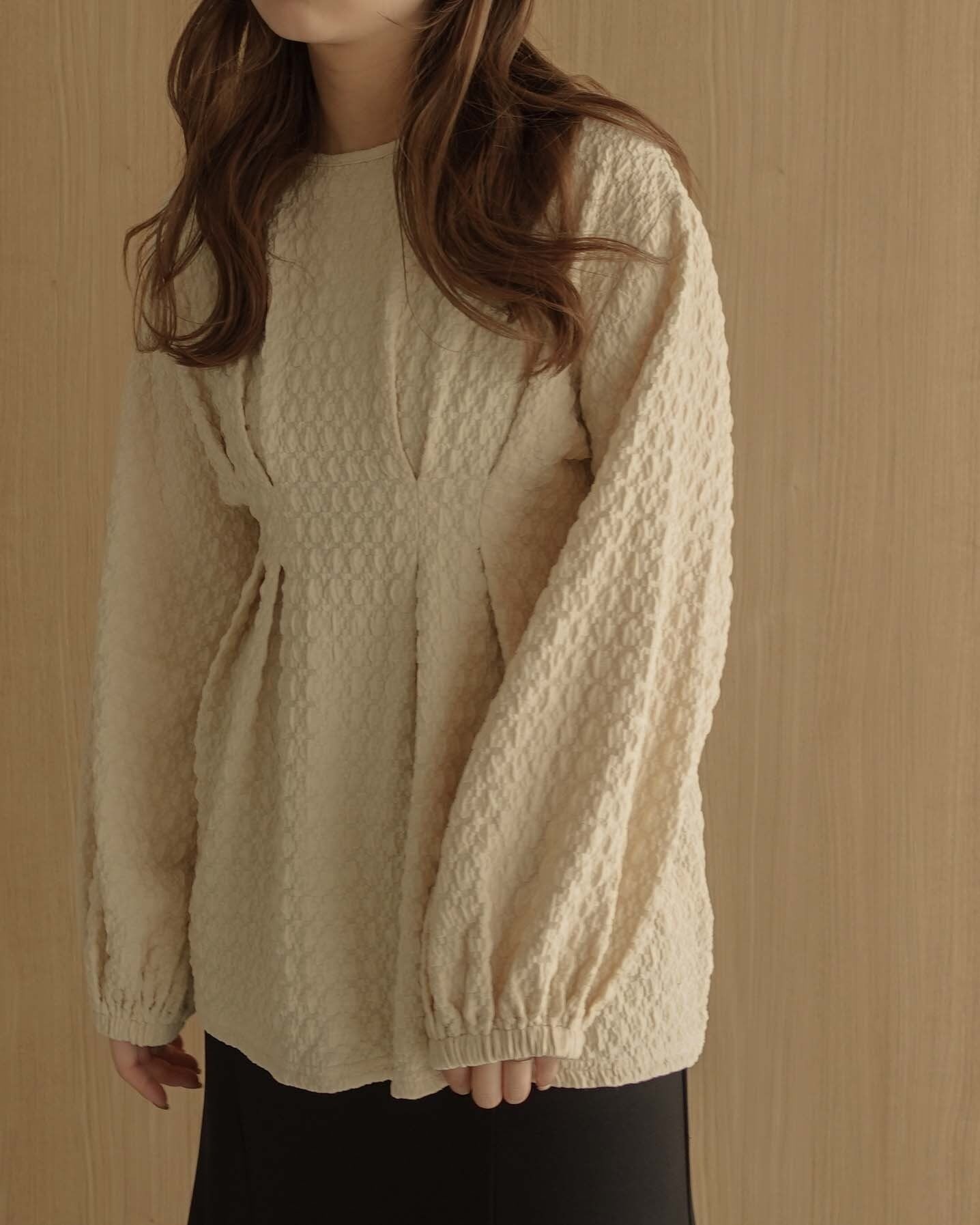 ぽこっとした素材と、ウエストのタックがポイントのトップス。