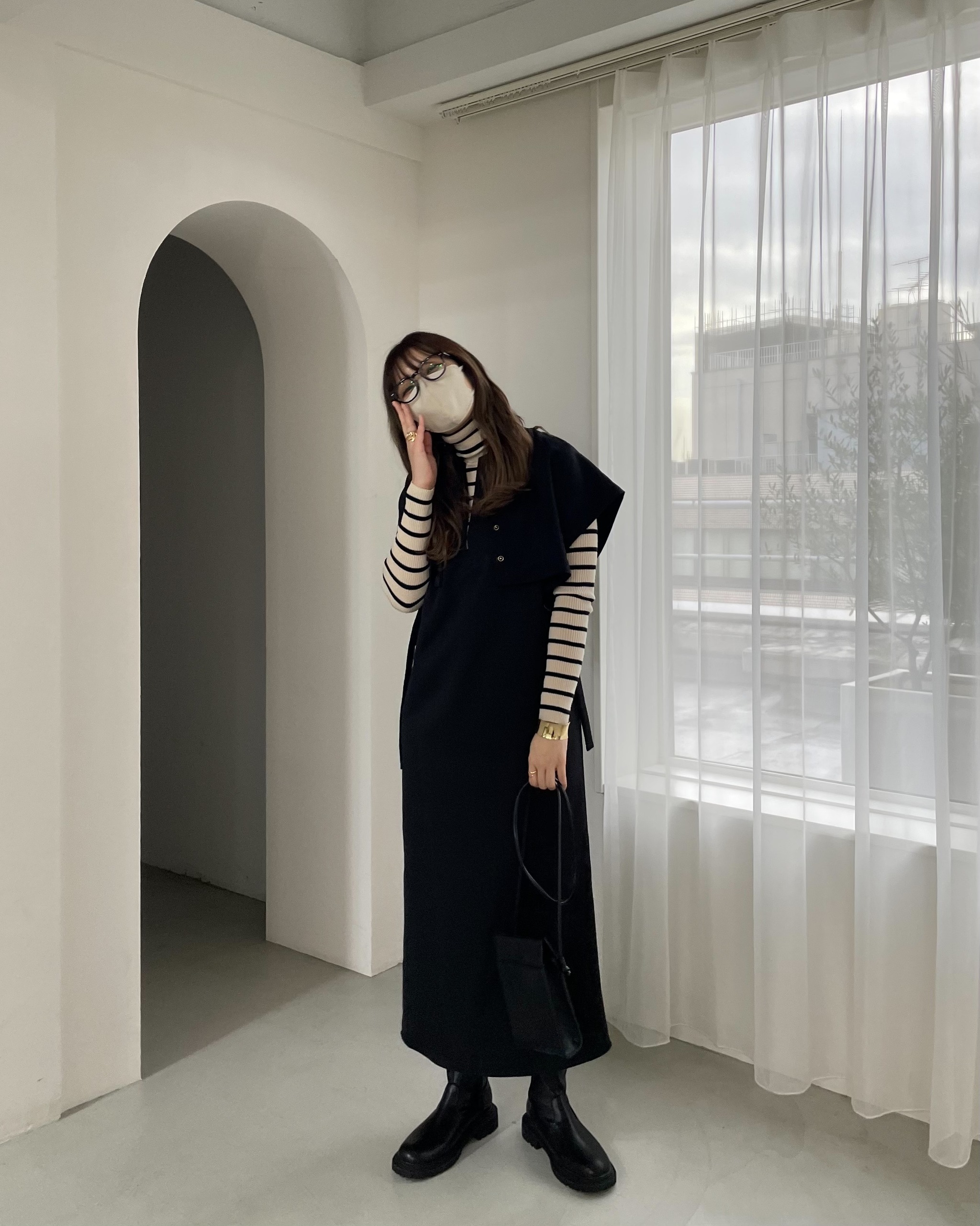 トレンドのボーダートップスを忍ばせたレイヤードコーデ。