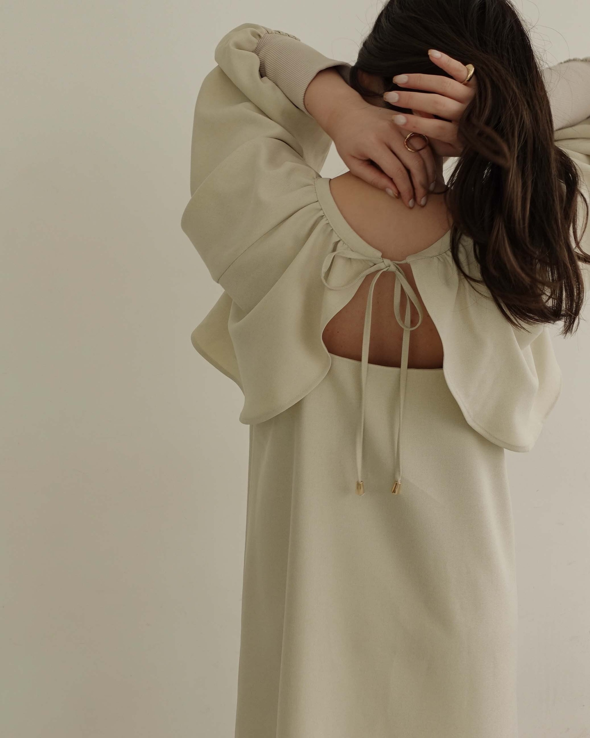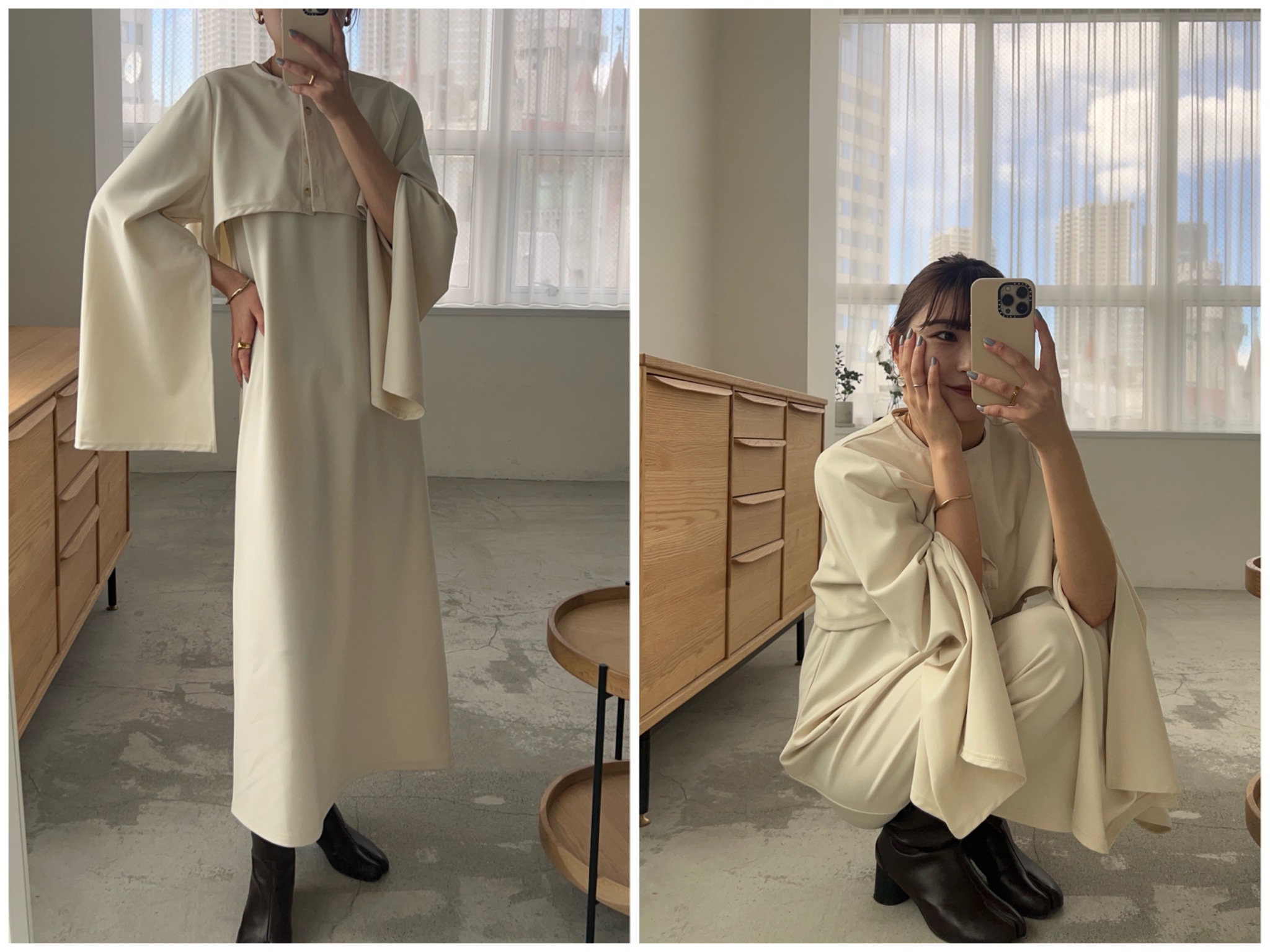 カーディガンは袖がフレアでスリットが入って今年らしいアイテム。
