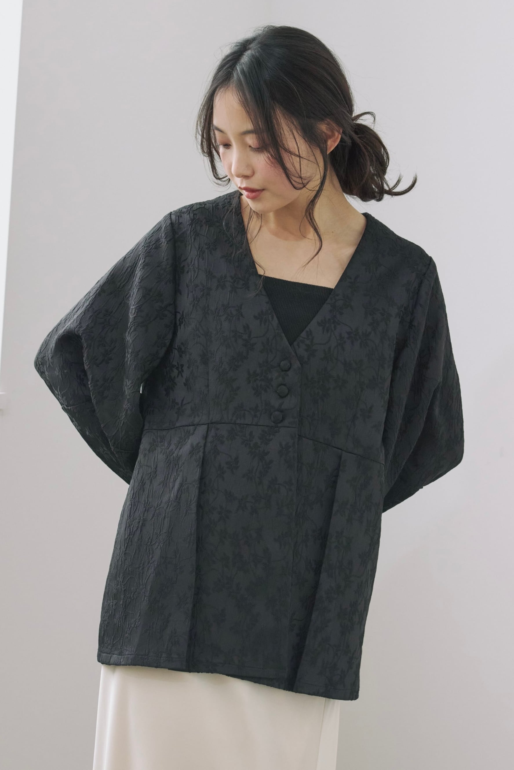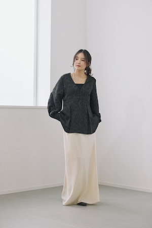 フロントはVネックあきで顔まわりをすっきり見せながら、