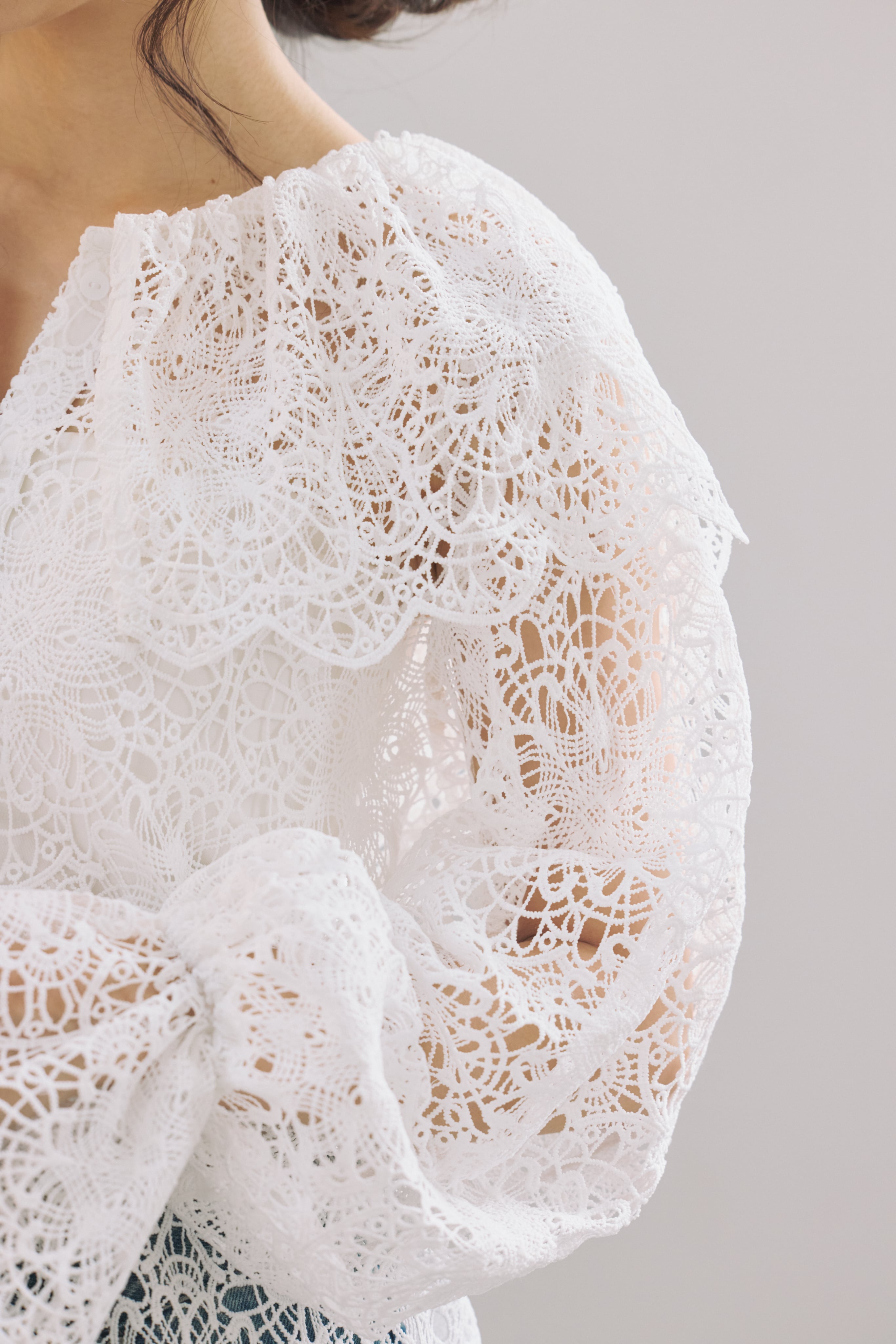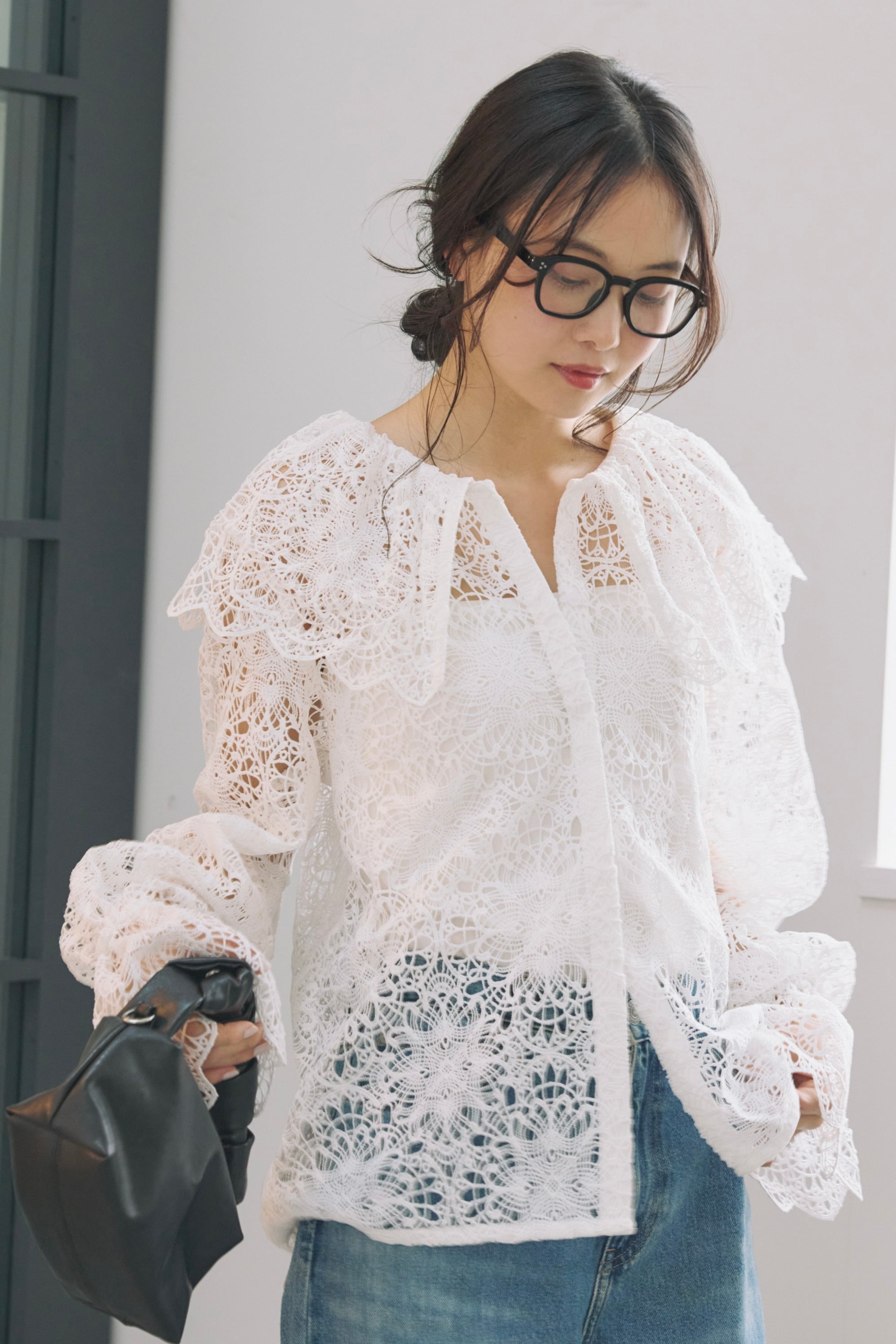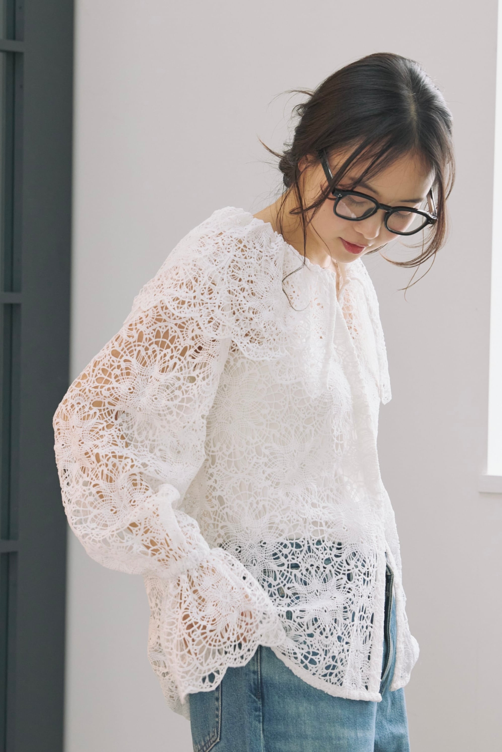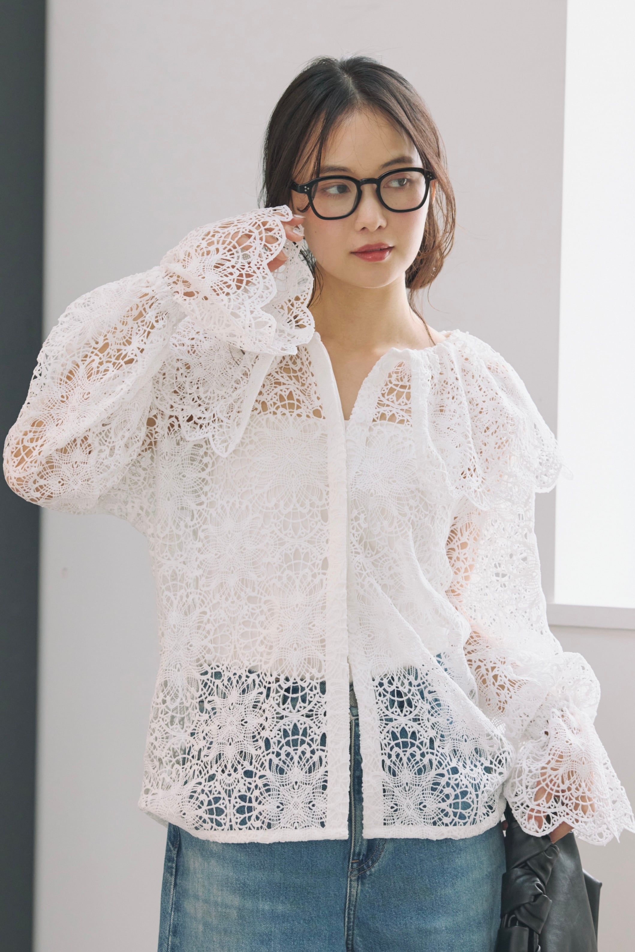 繊細な表情が目を惹く、総レース素材のラッフルカラーブラウス