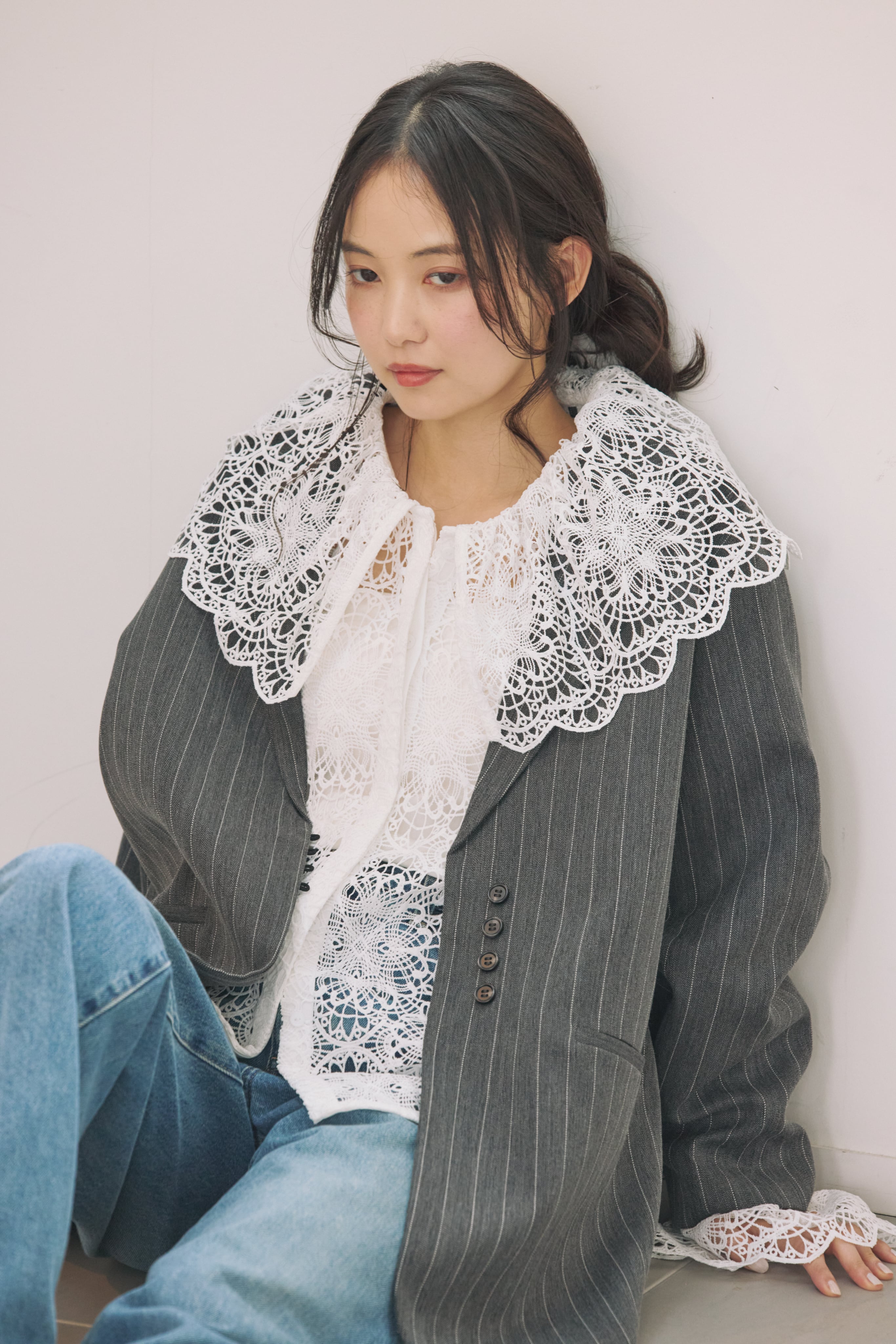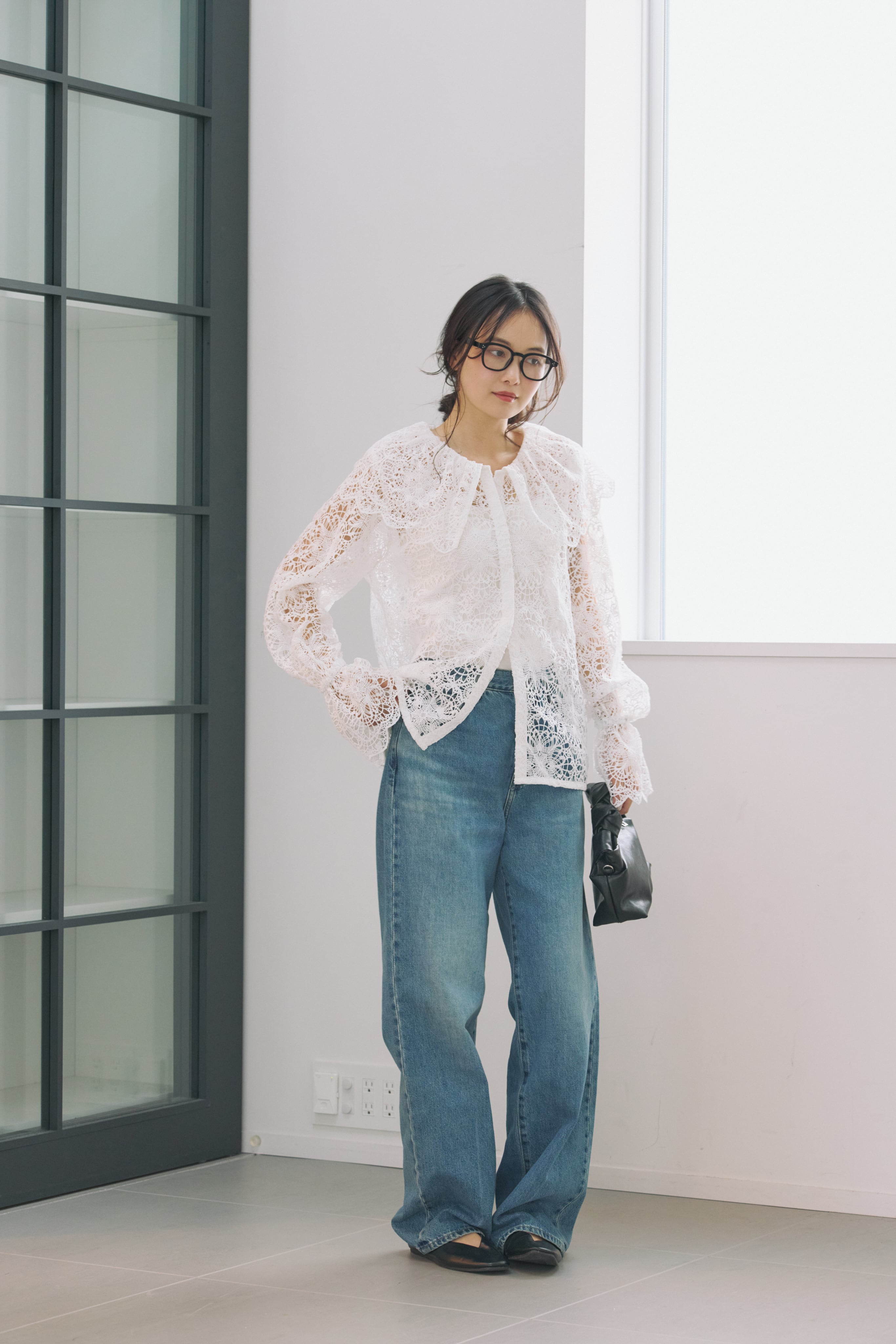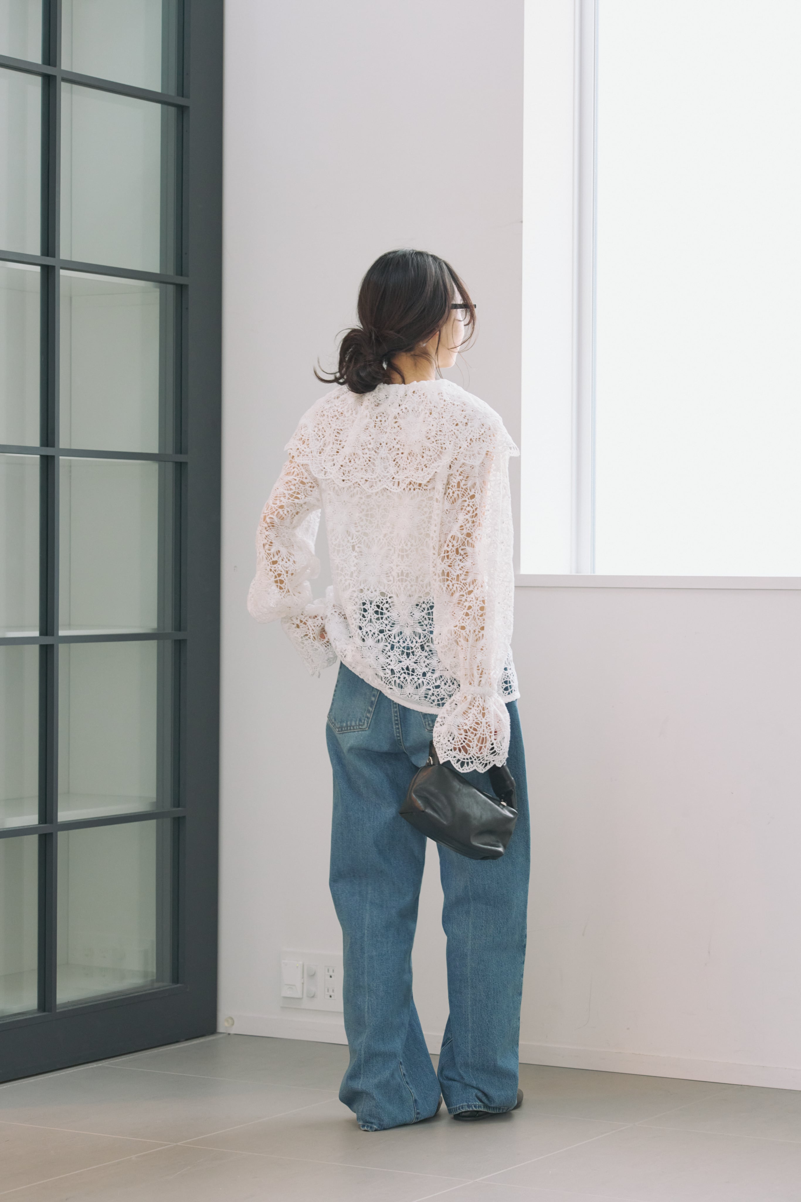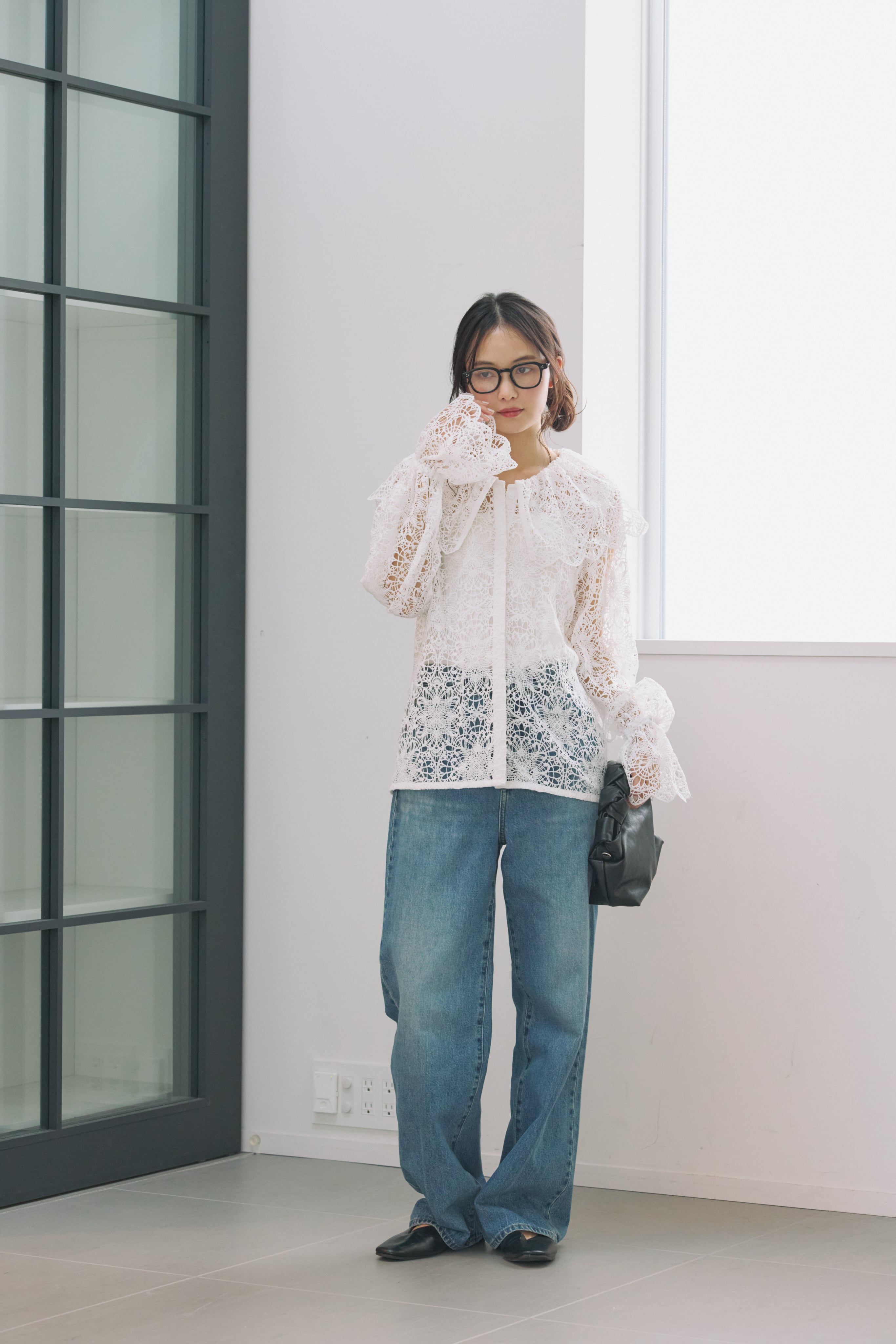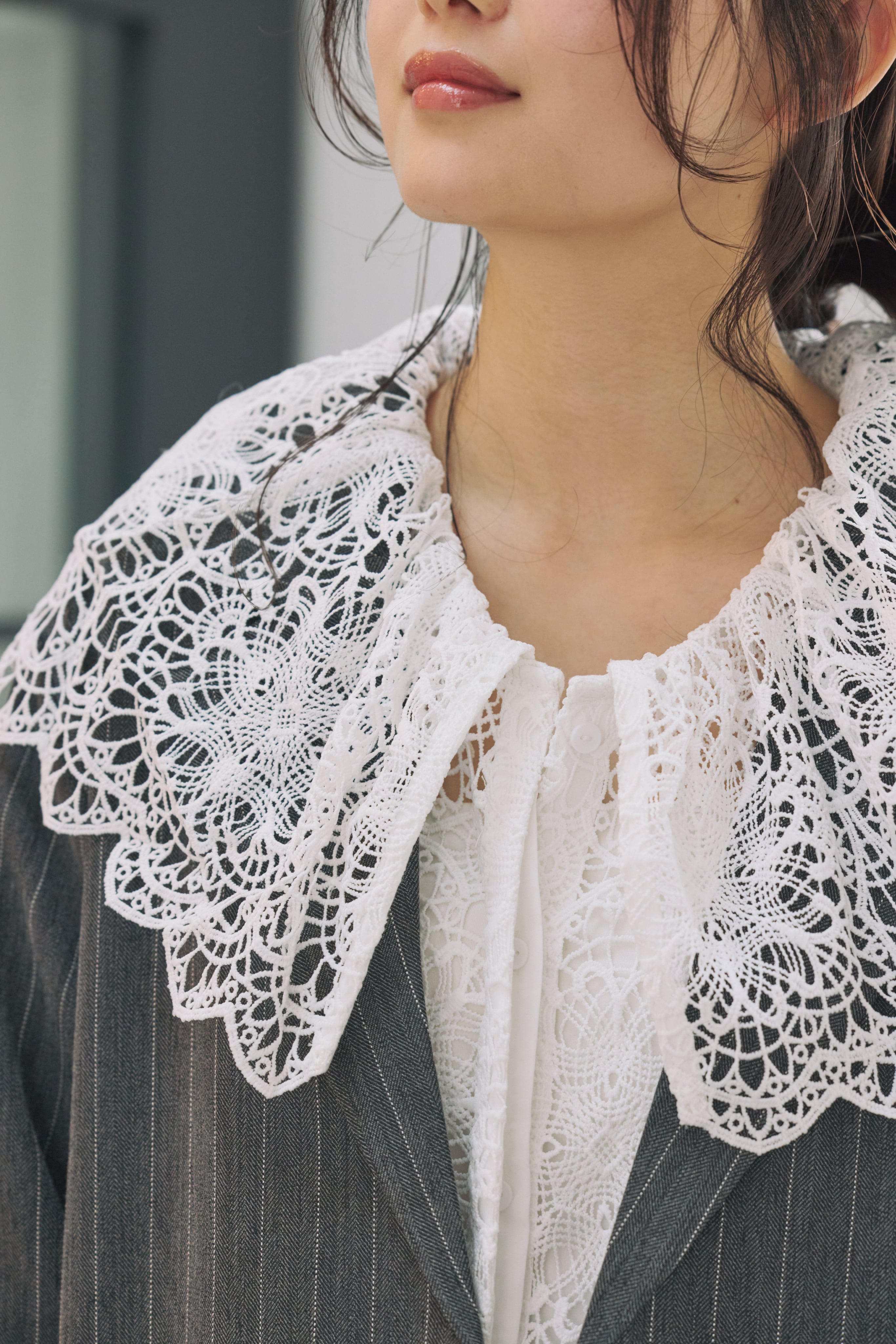 繊細な表情が目を惹く、総レース素材のラッフルカラーブラウス