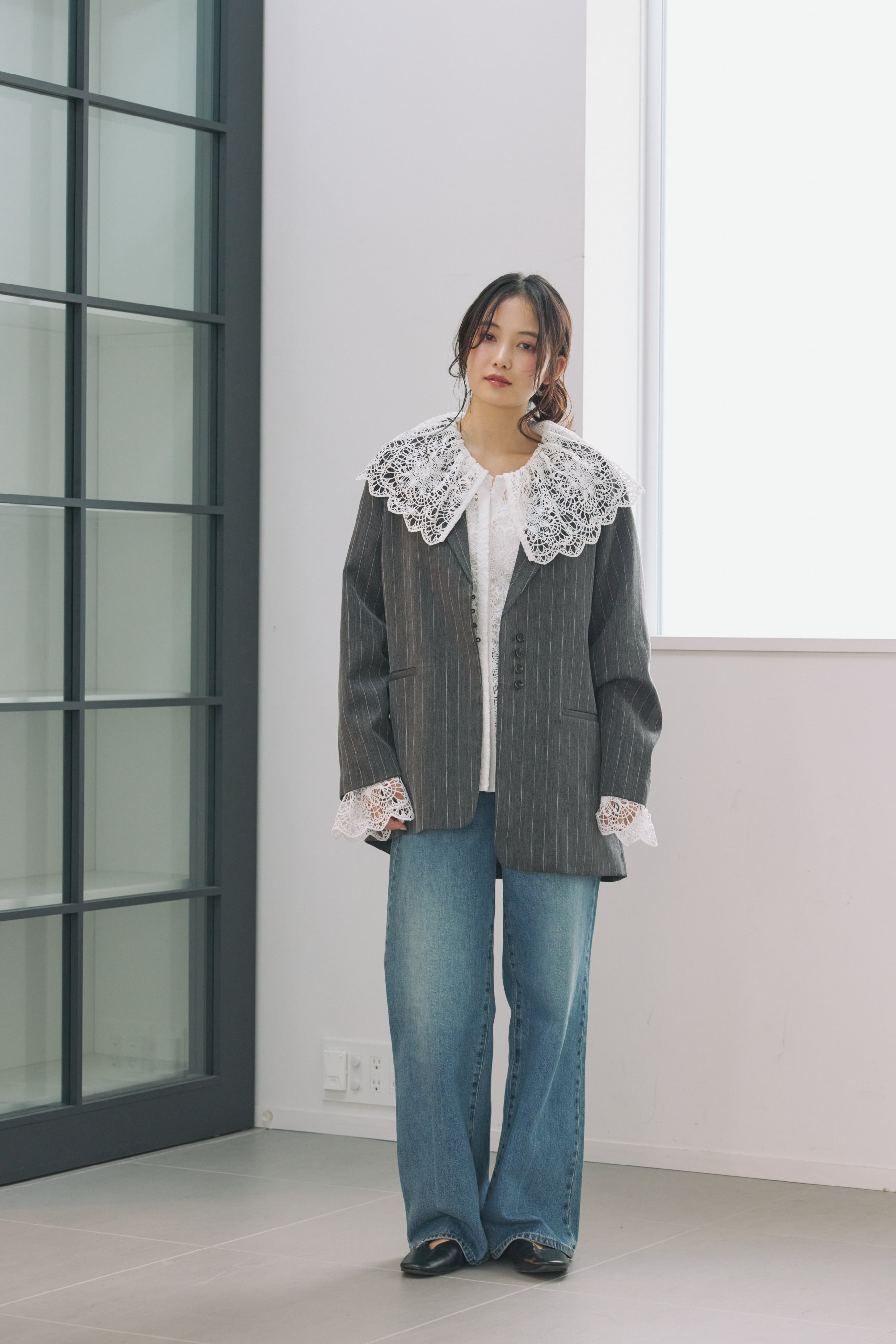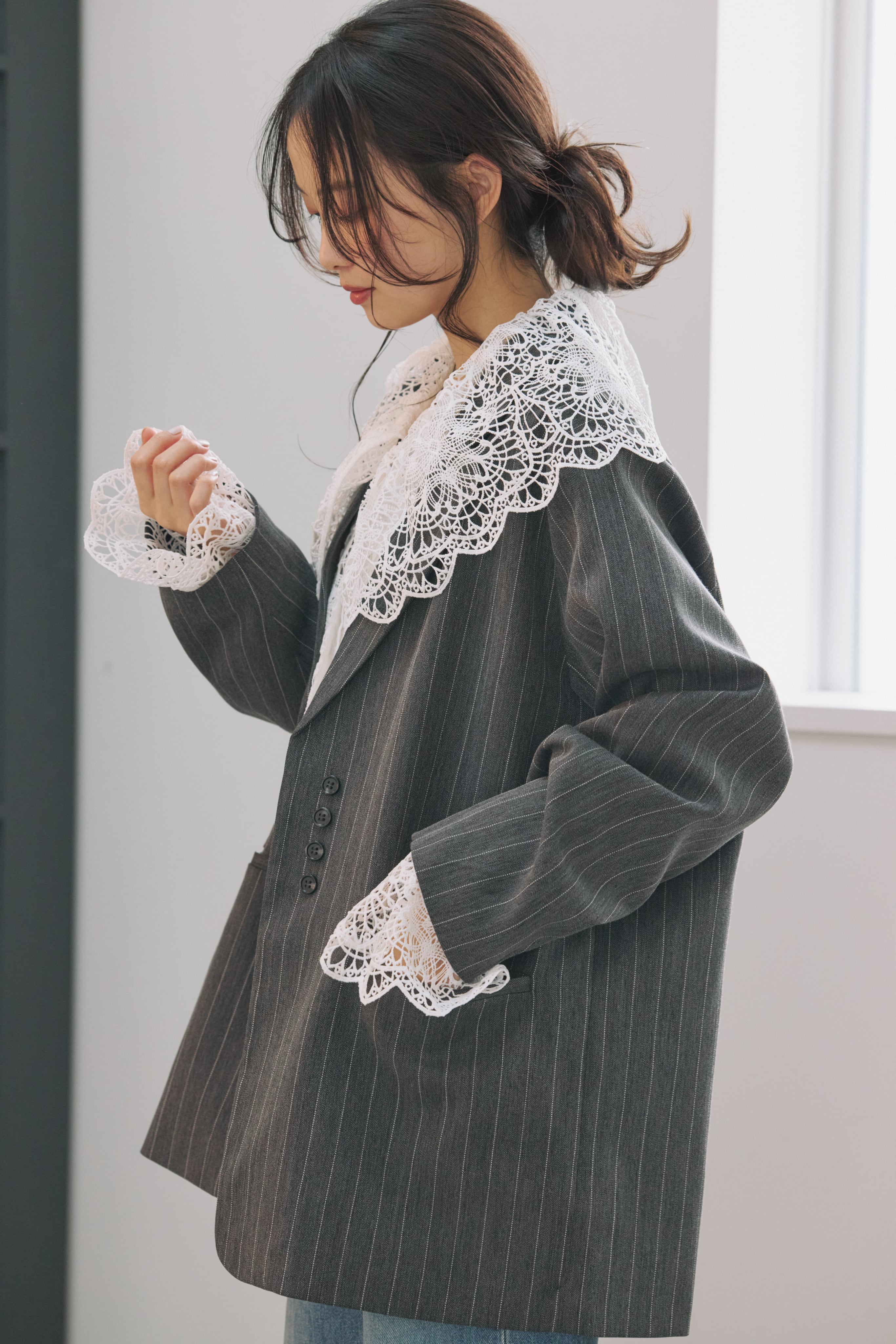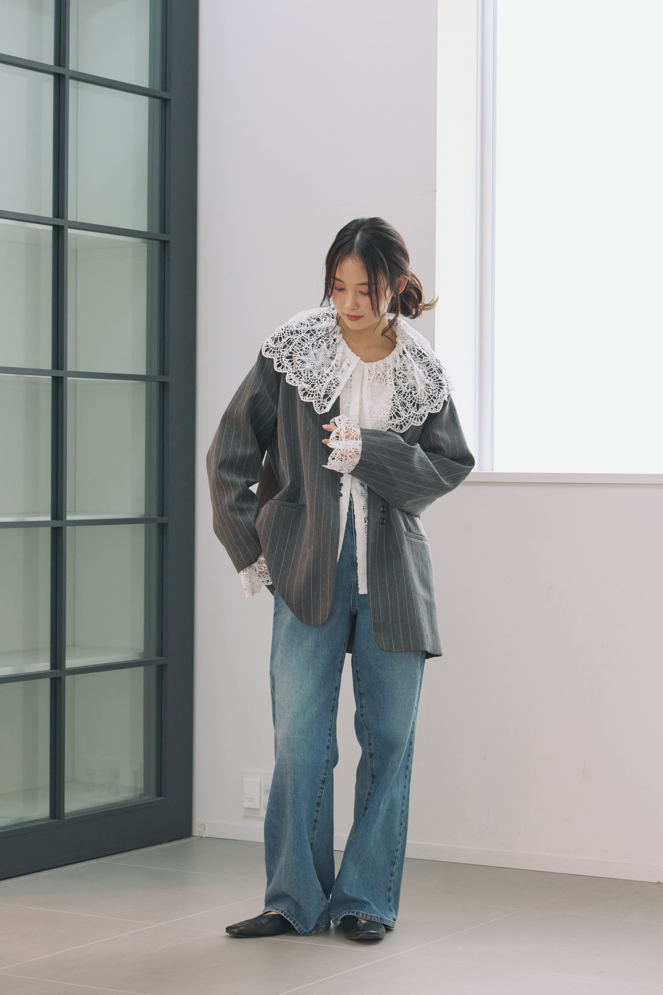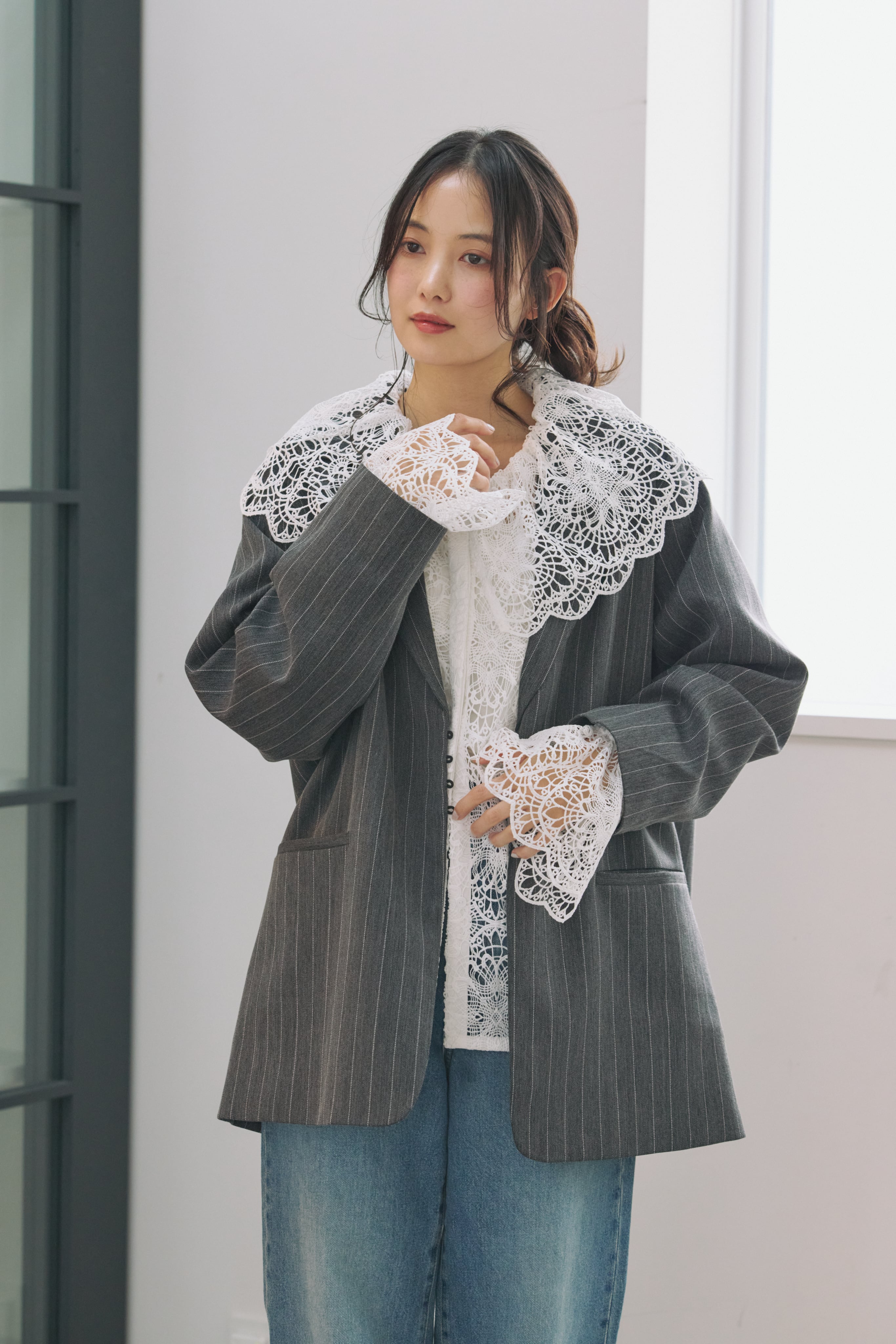 繊細な表情が目を惹く、総レース素材のラッフルカラーブラウス