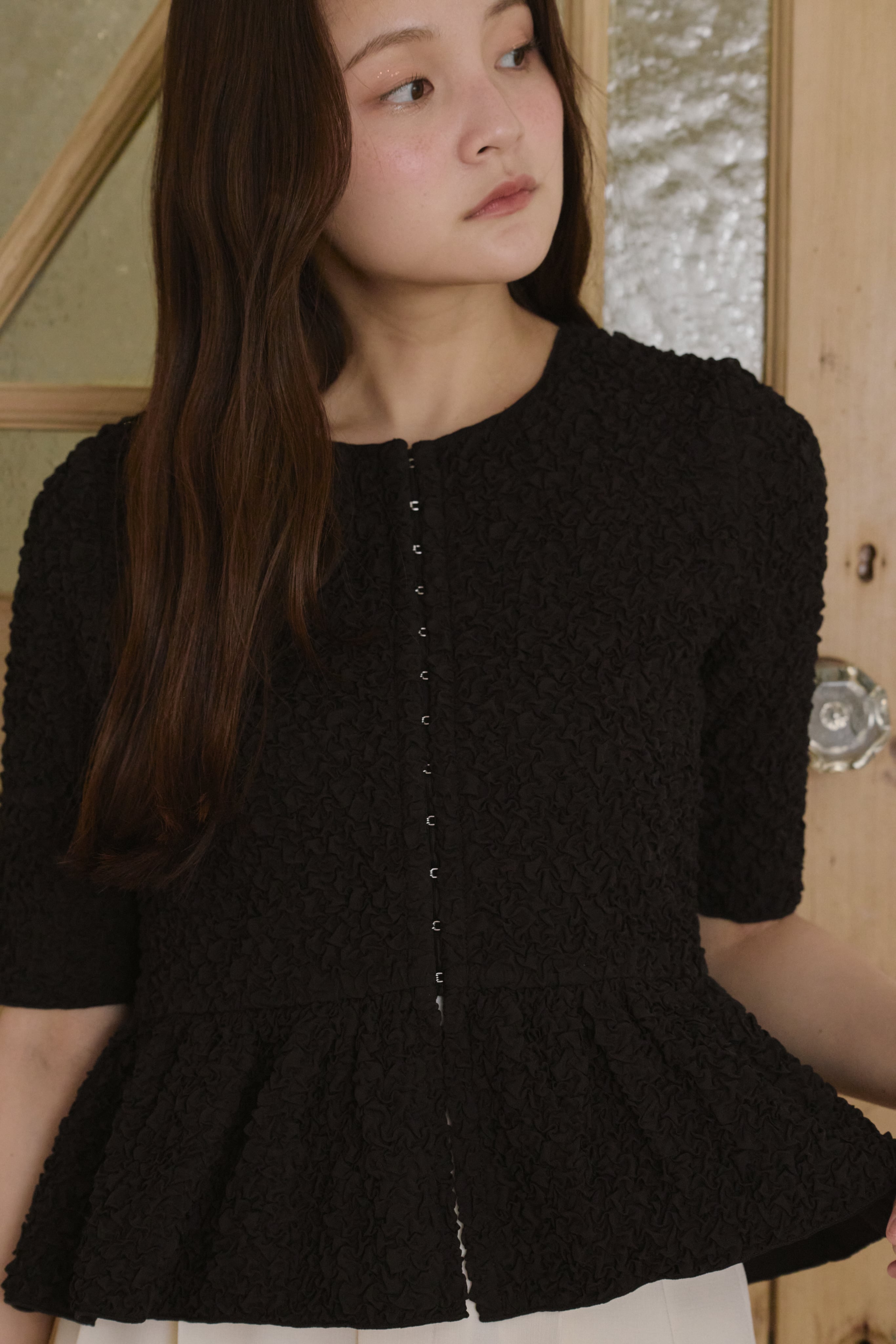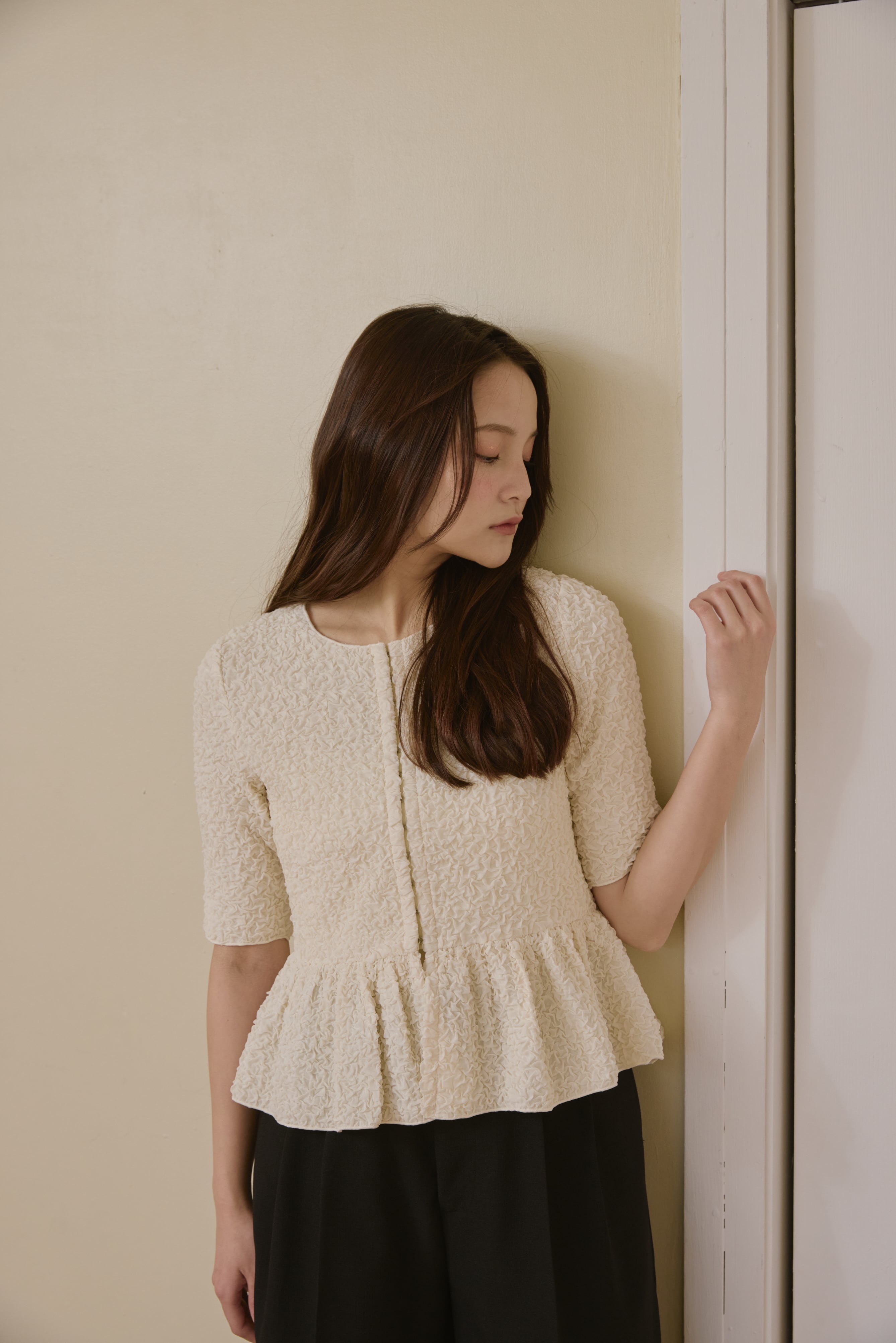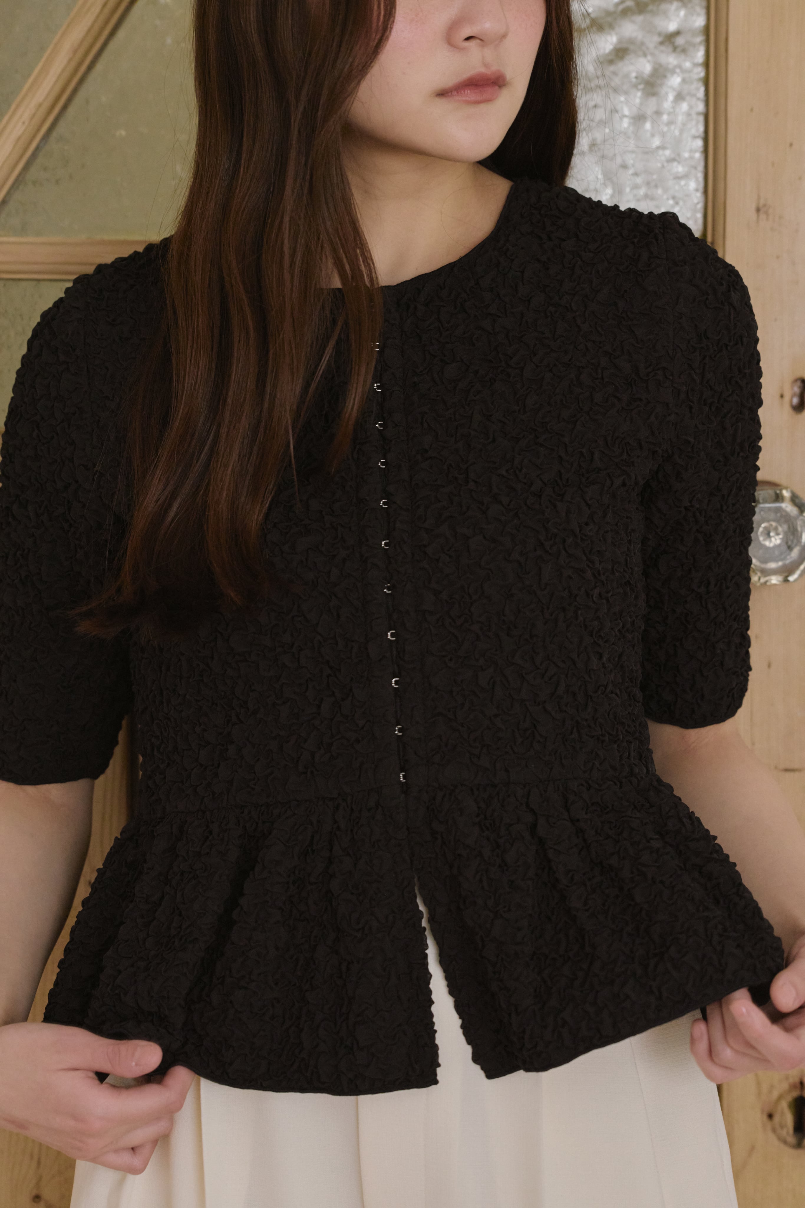 表情のあるポコポコとした生地感が目を惹く、着映えトップス