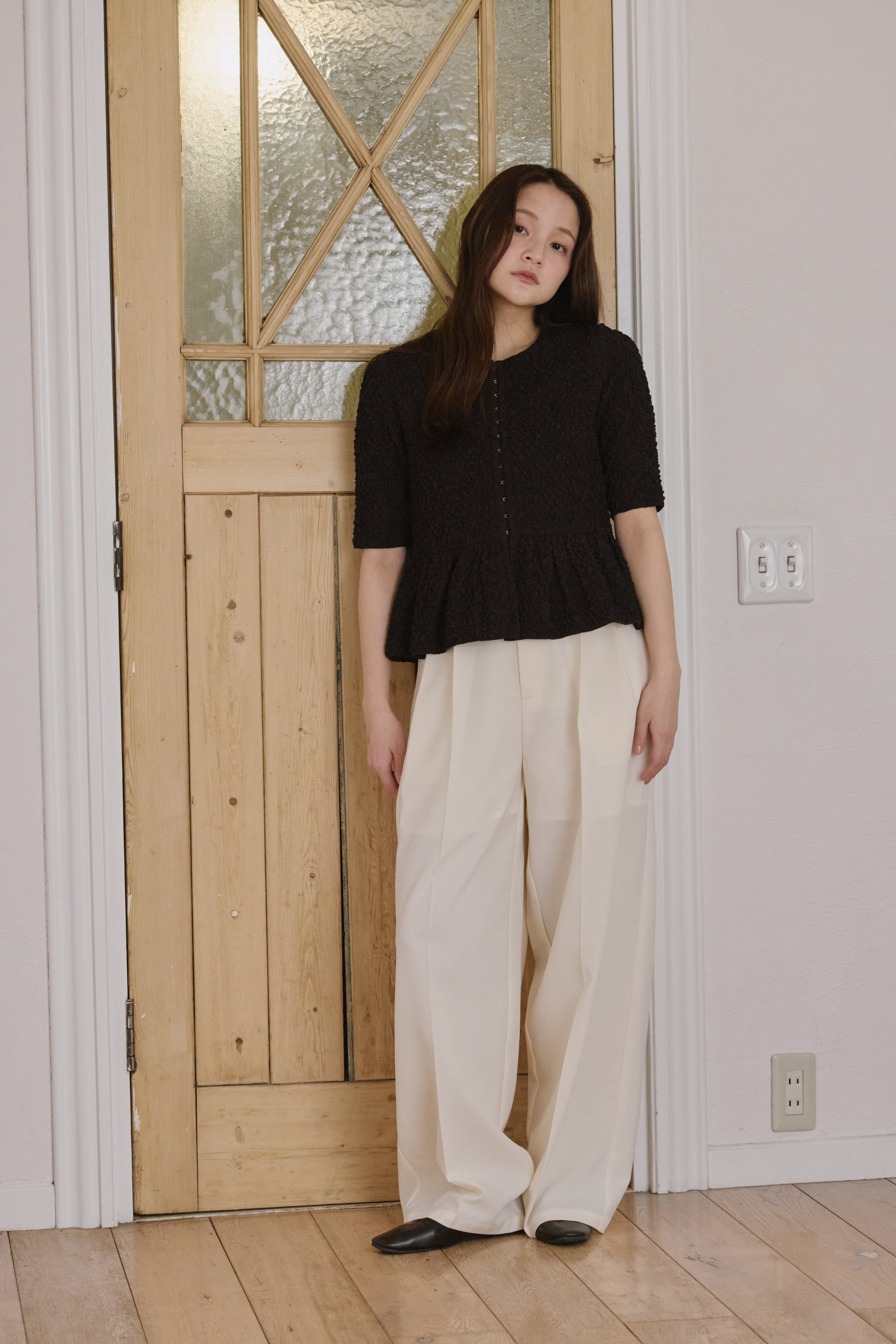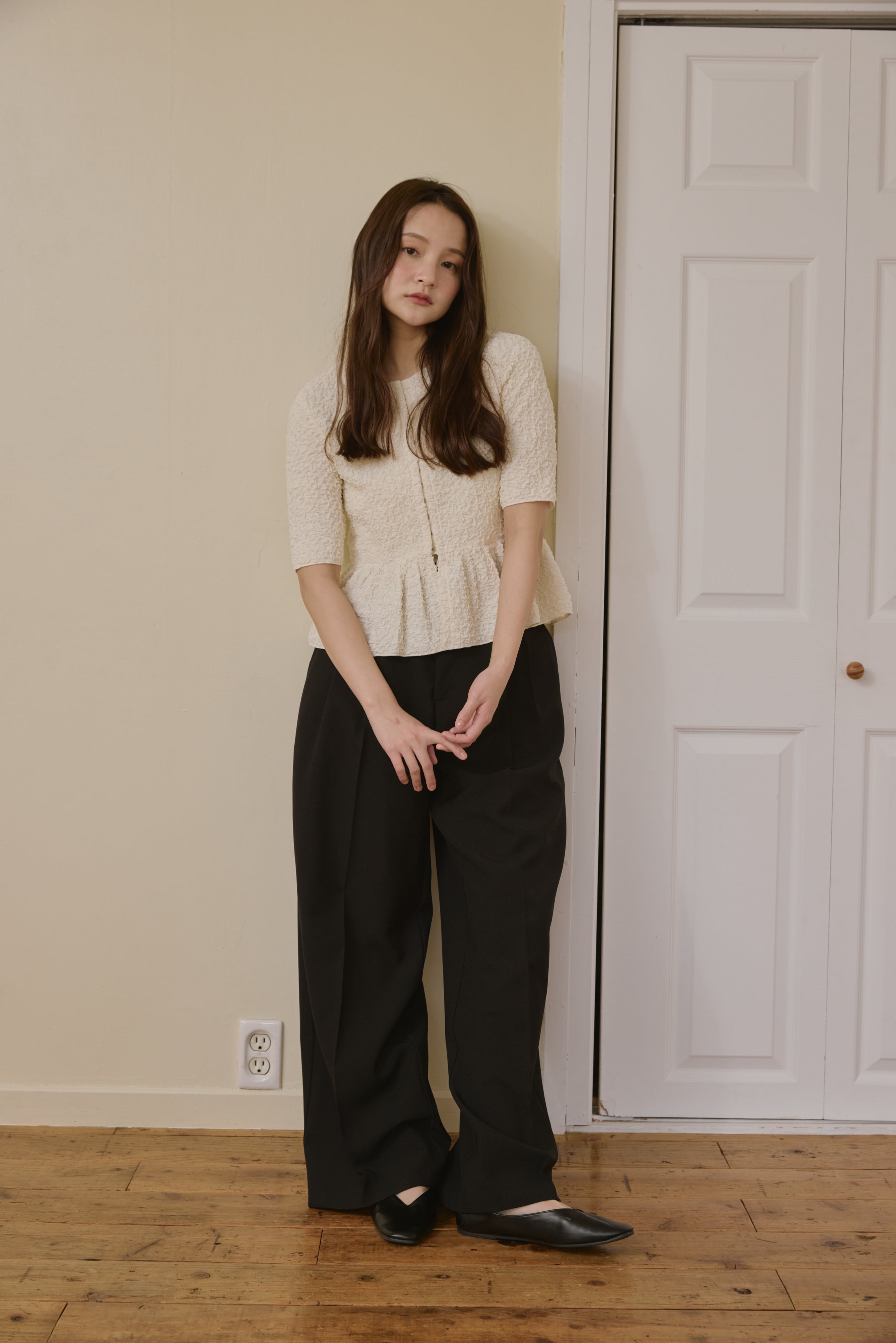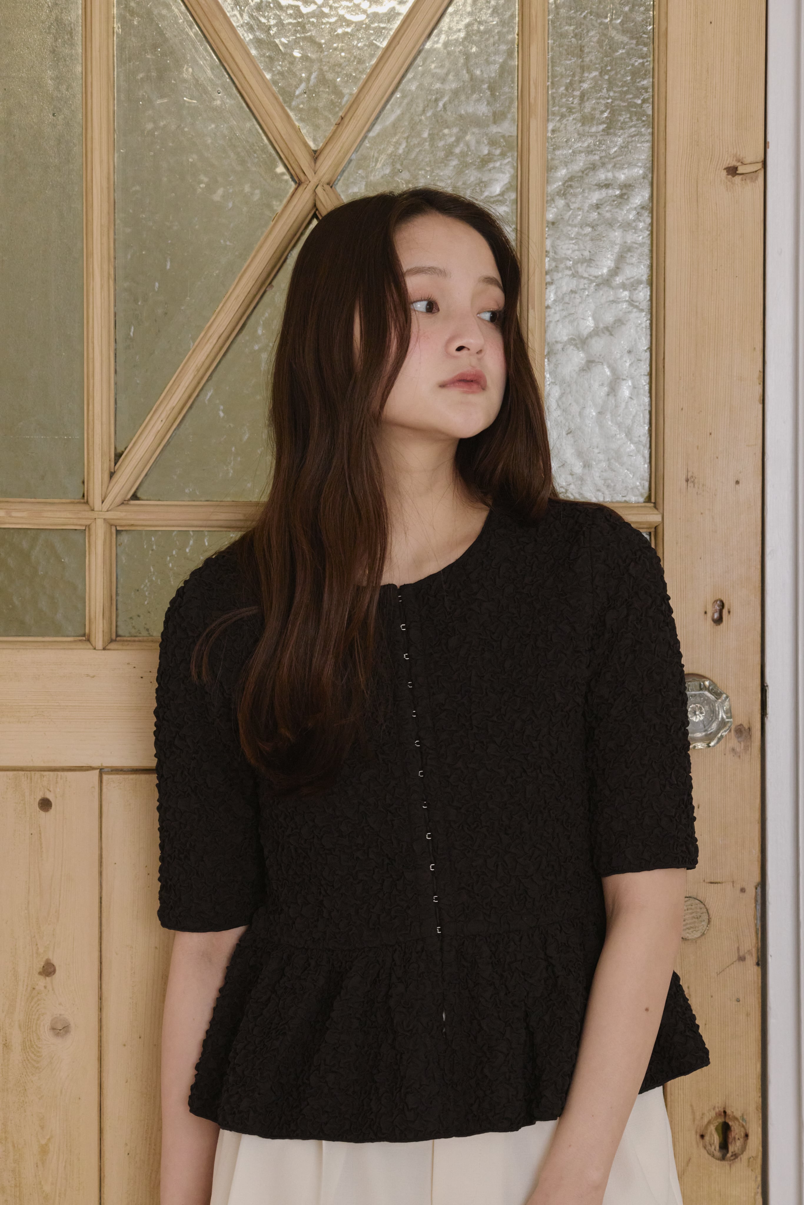 表情のあるポコポコとした生地感が目を惹く、着映えトップス