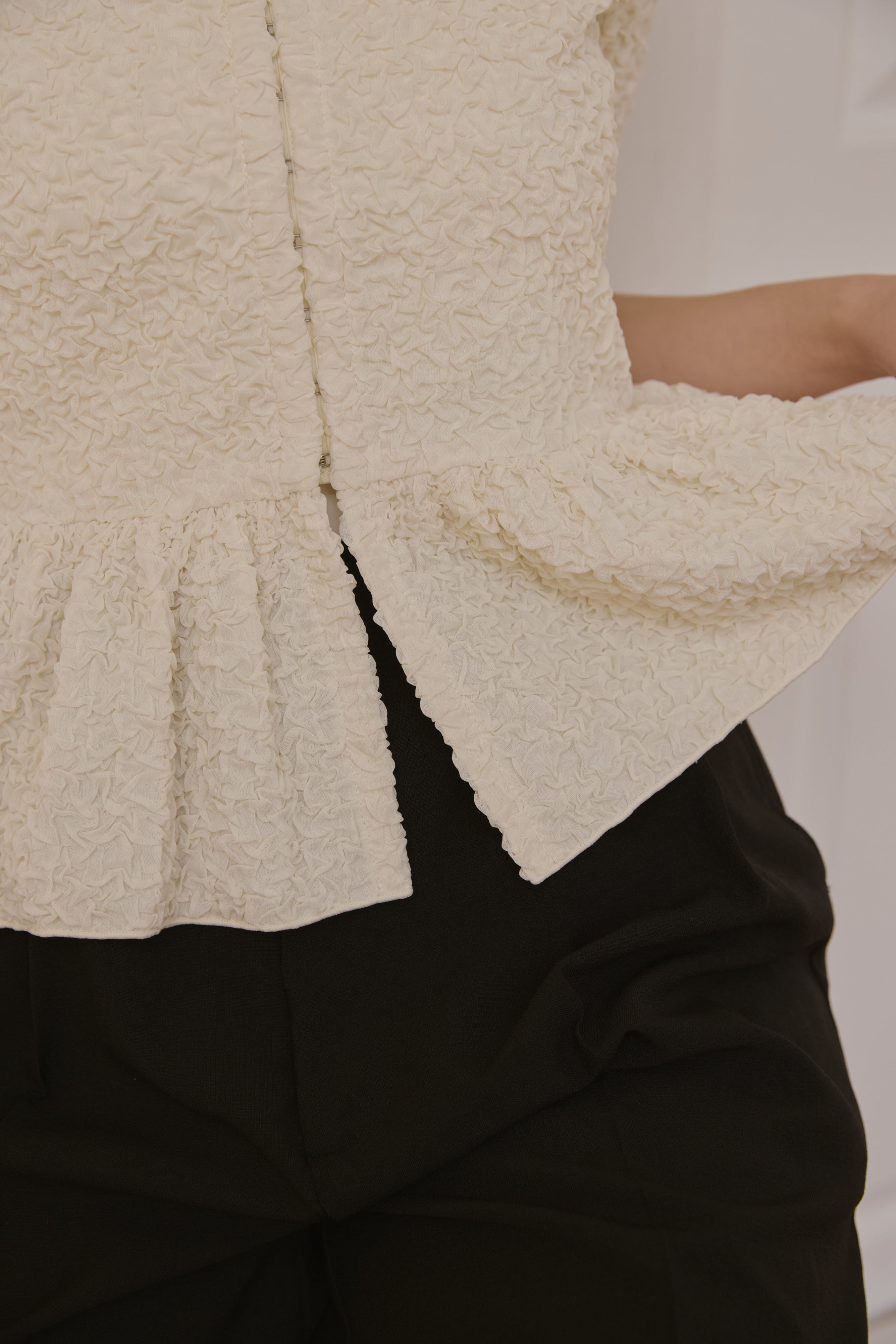 コンパクトな丈感に、裾に向かって広がるペプラムシルエットが