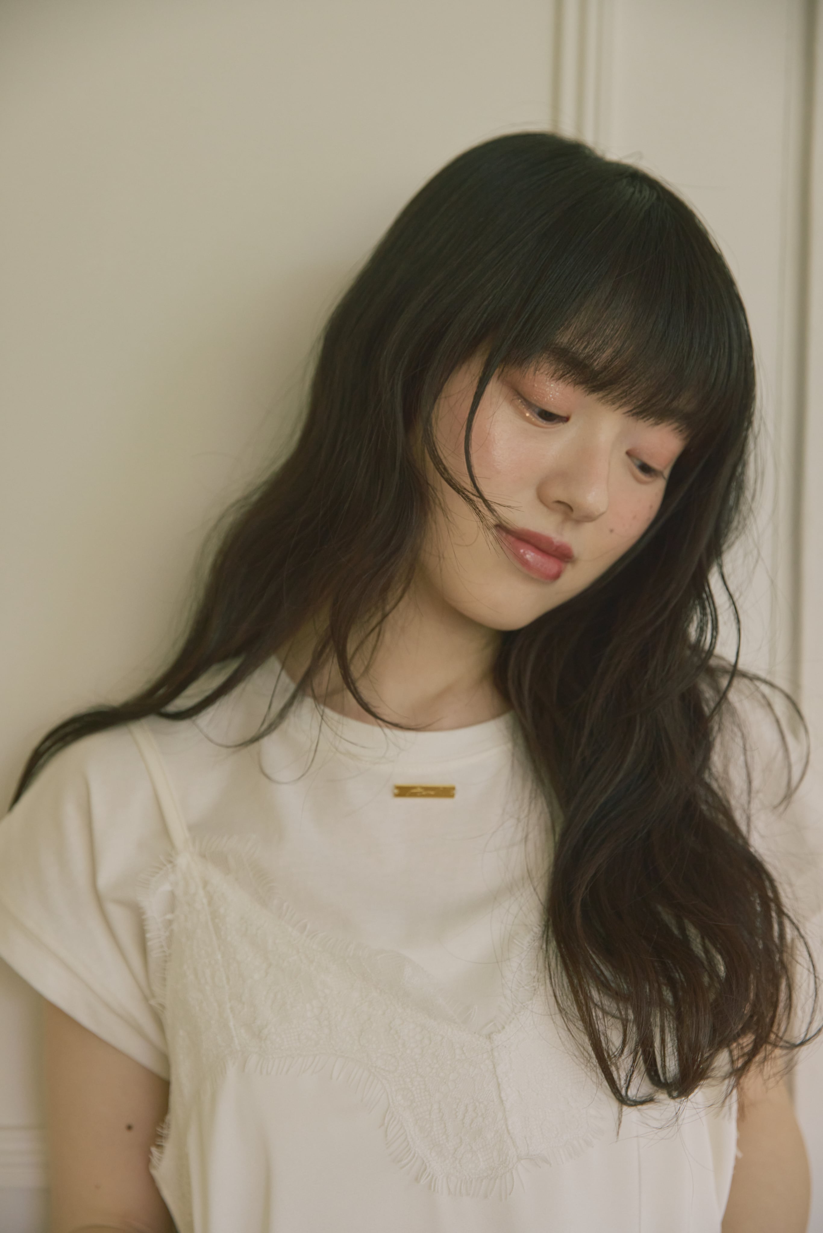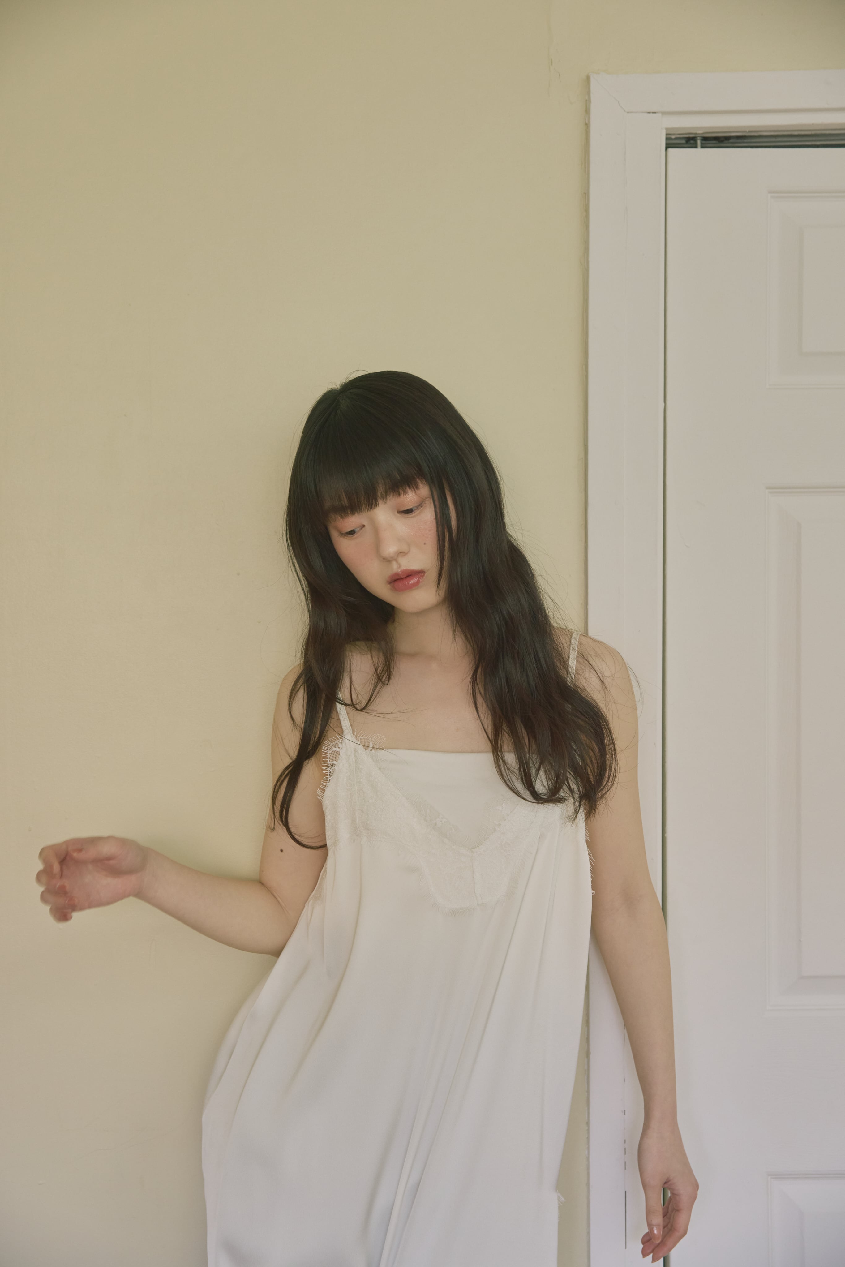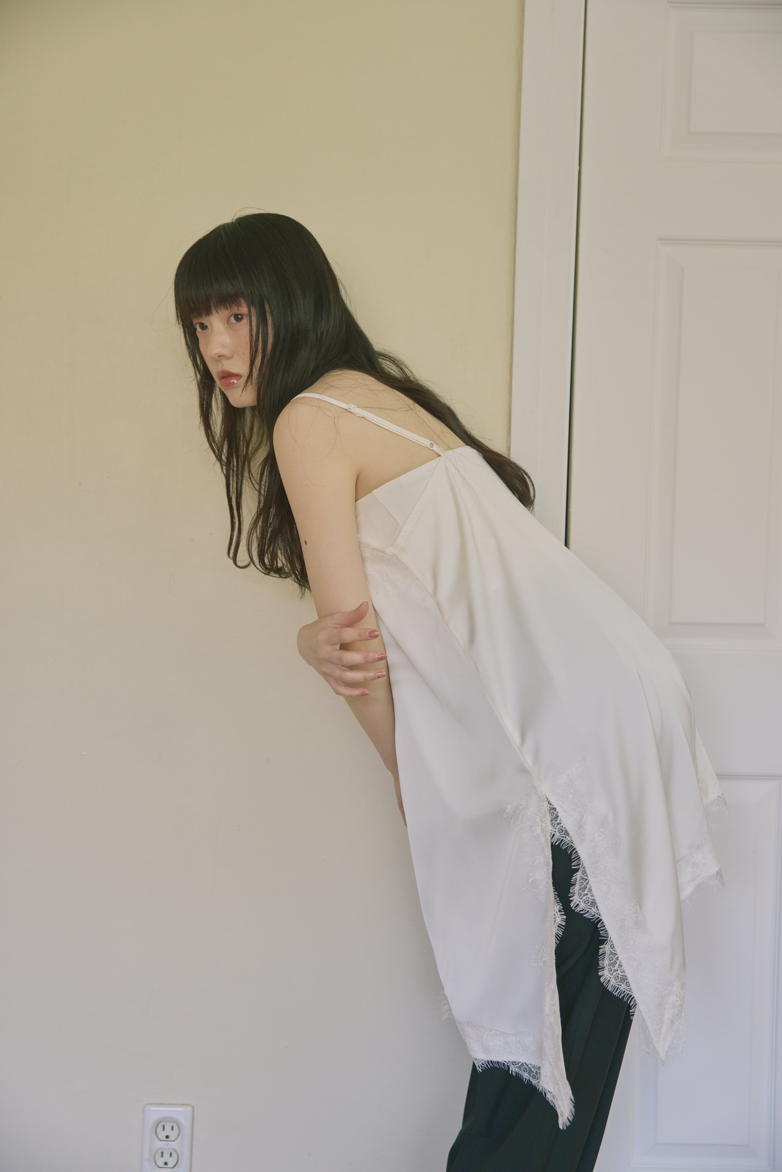 洗練された抜け感を演出する、アシンメトリーサテンキャミ